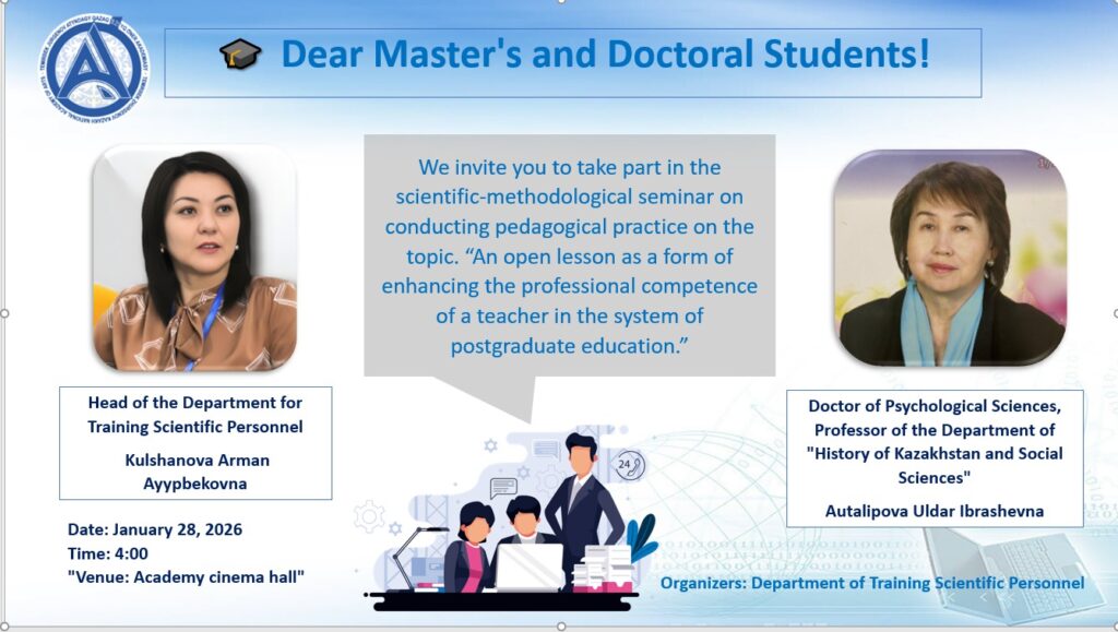 Dear Master’s and Doctoral students! We invite you to take part in the methodological seminar on conducting pedagogical practice on the topic “An Open Lesson as a Form of Enhancing the Professional Competence of a Teacher in the System of Postgraduate Education.” The seminar will be held on January 28, 2026, at 4:00 PMin the cinema hall of the Kazakh National Academy of Arts named after Temirbek Zhurgenov.
