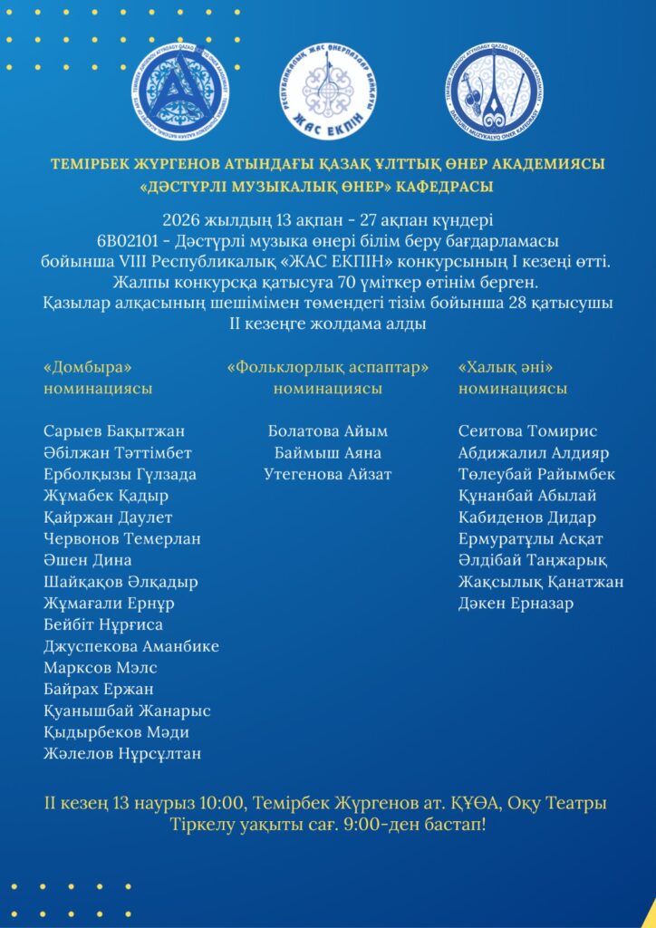 2026 жылдың 13-27 ақпан күндері «6B02101 – Дәстүрлі музыка өнері» білім беру бағдарламасы бойынша VIII Республикалық «Жас екпін» байқауының І кезеңі өтті.