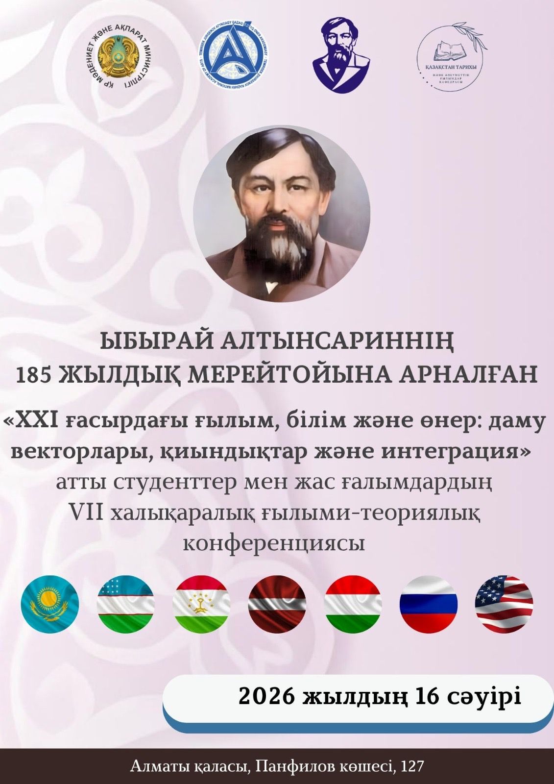 6 апреля кафедра История Казахстана и социальныз наук проводит VII международную научно-теоретическую конференцию молодых ученых и студентов«Наука, образование и искусство XXI века: векторы развития, вызовы и интеграция», посвященную 185-летиюсо дня рождения Ыбырая Алтынсарина.