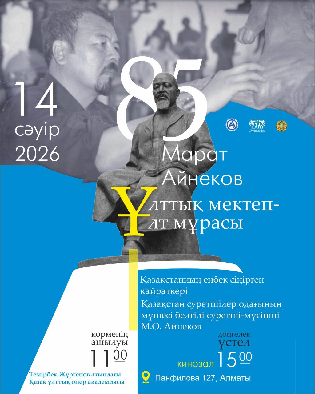3) 14 сәуір 2026 ж. сағат 15.00-де – Т. Жүргенов ҚазҰӨА-сының профессоры, Қазақстанның еңбек сіңірген қайраткері, белгілі суретші-мүсінші М. О. Айнековтың туғанына 85 жыл толуына байланысты «Мүсін» БББ ұстаздары, студенттері, магистранттары және докторанттары қатысуымен Дөңгелек үстел өткізу. Модератор – профессор Е. Б. Кайранов, көмекшілері – аға оқытушы А. А. Орманбеков, оқытушы Қ. Б. Асылбай. Өткізілетін орны: Т. Жүргенов ҚазҰӨА Кинозалы, Алматы қ. Панфилов көшесі, 127.